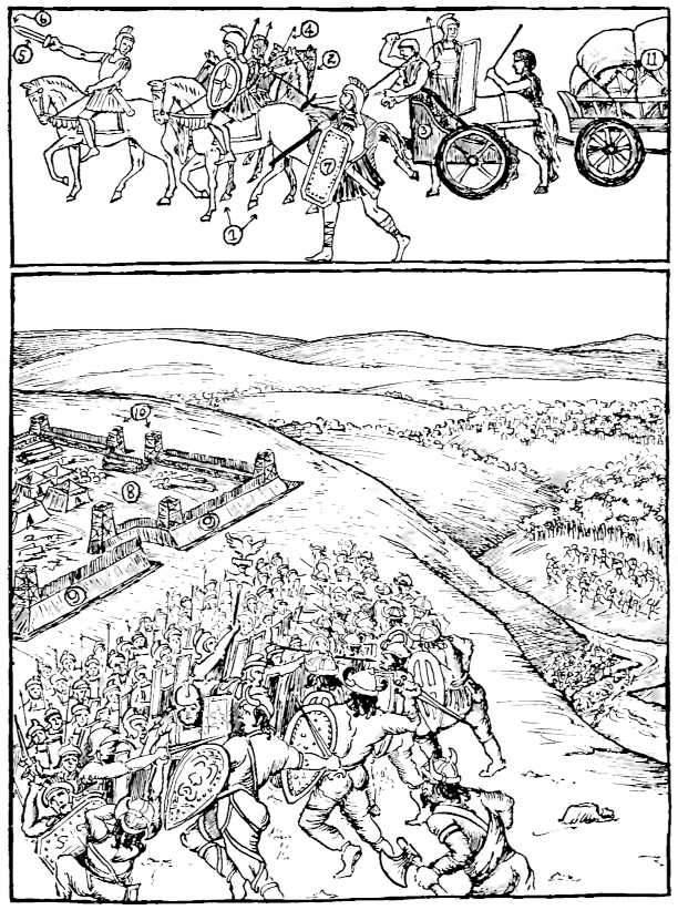 Multum adiuvābant legiō septima quoque et duae legiōnēs quibus negōtium fuerat ut post commeātuī subsidiō venīrent. Illī quidem quī ad ulteriōrem partem castrōrum fūgerant, quod timērent nē occīderentur, nōn iam perīculum vidēbant, et sine tēlīs pugnābant.